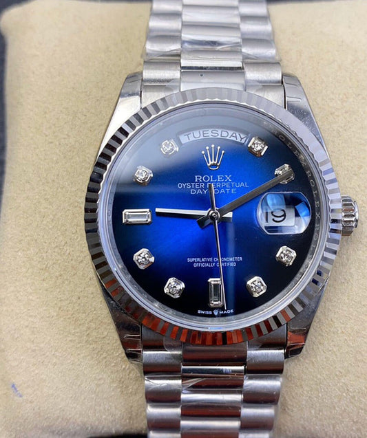 Rolex Day-Date 36 President White Gold Blue Baguette Dial Diamond Bezel