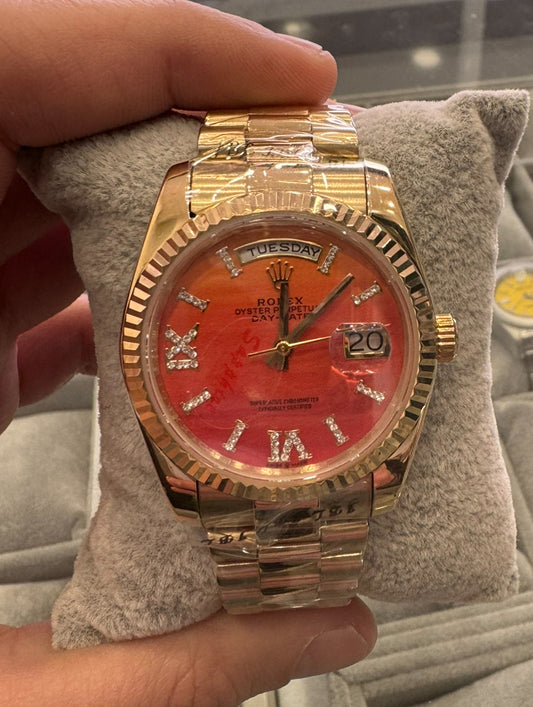 Rolex Day-Date 36 Yellow Gold Carnelian Orange Diamond Roman VI IX Dial & Fluted Bezel President Bracelet