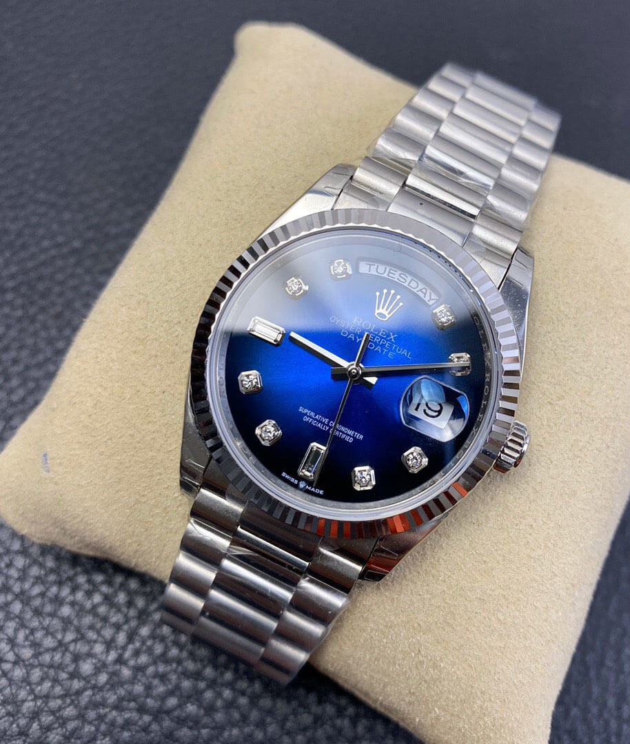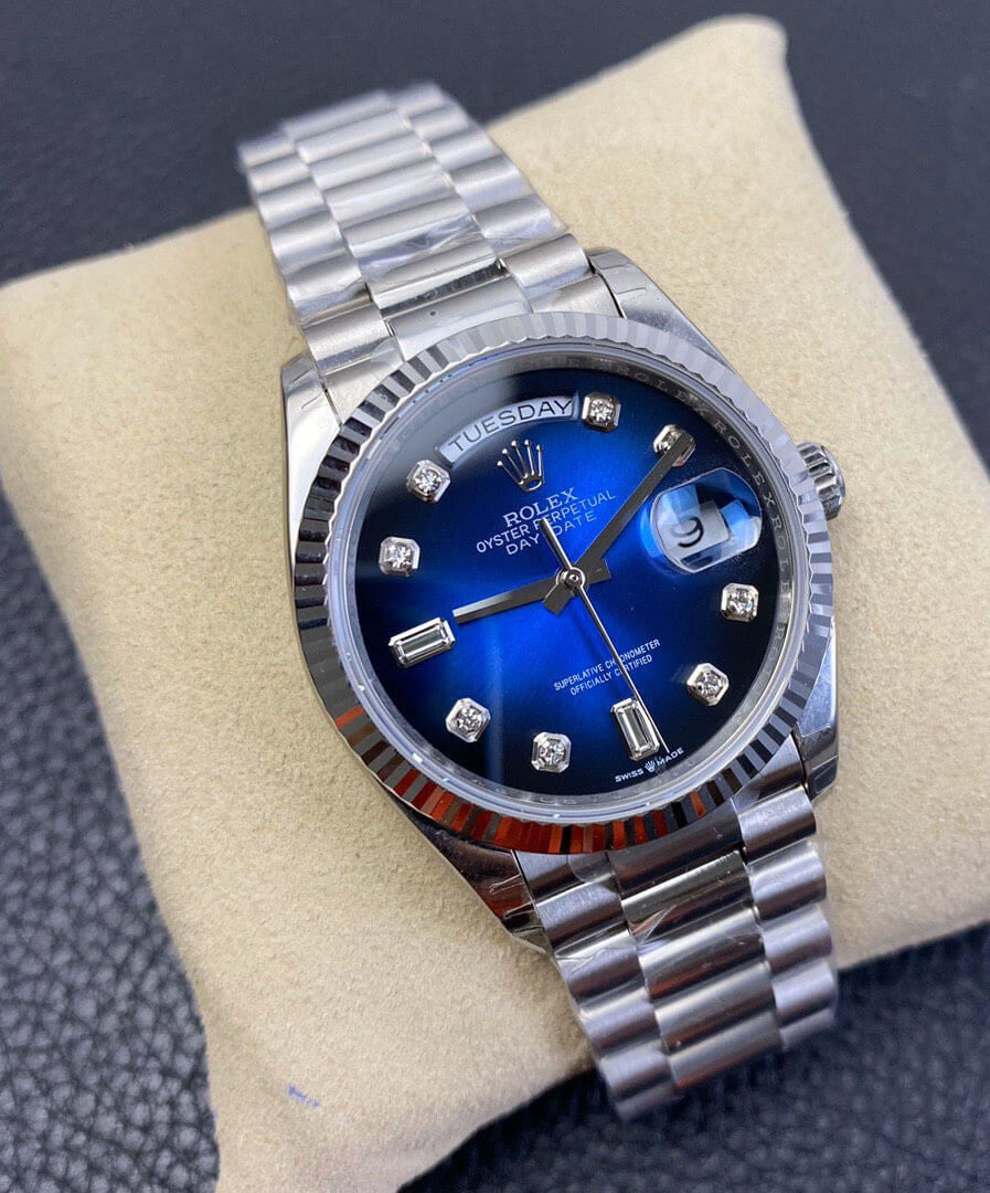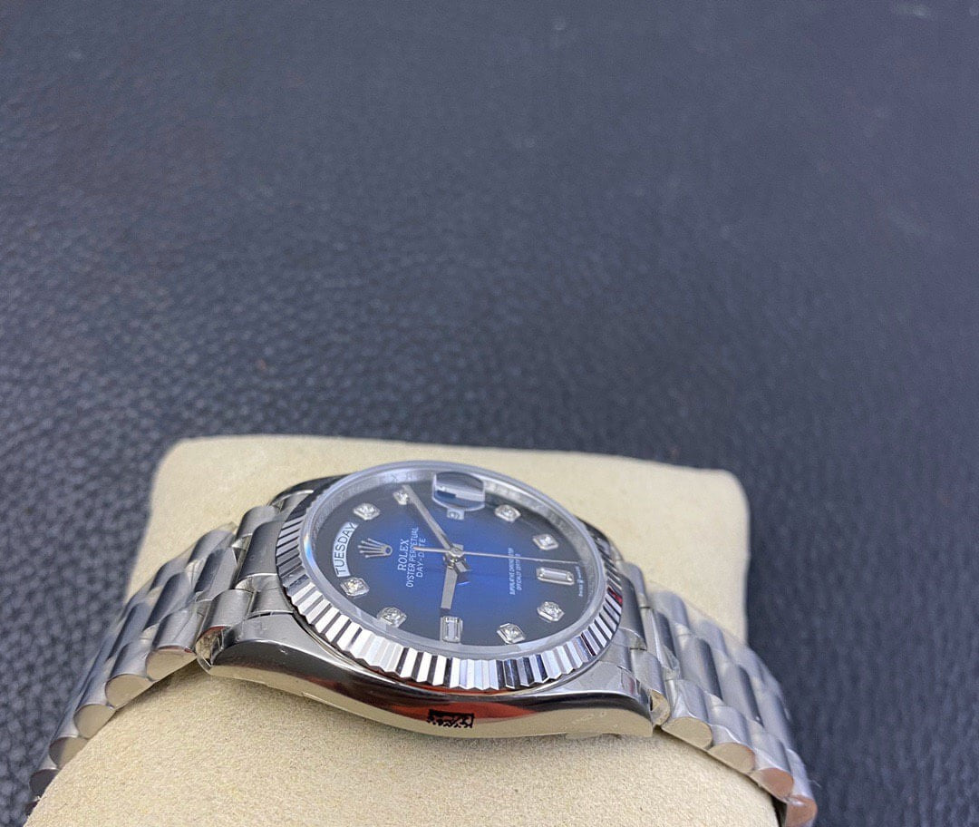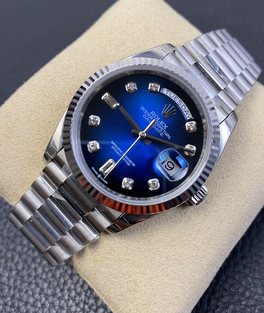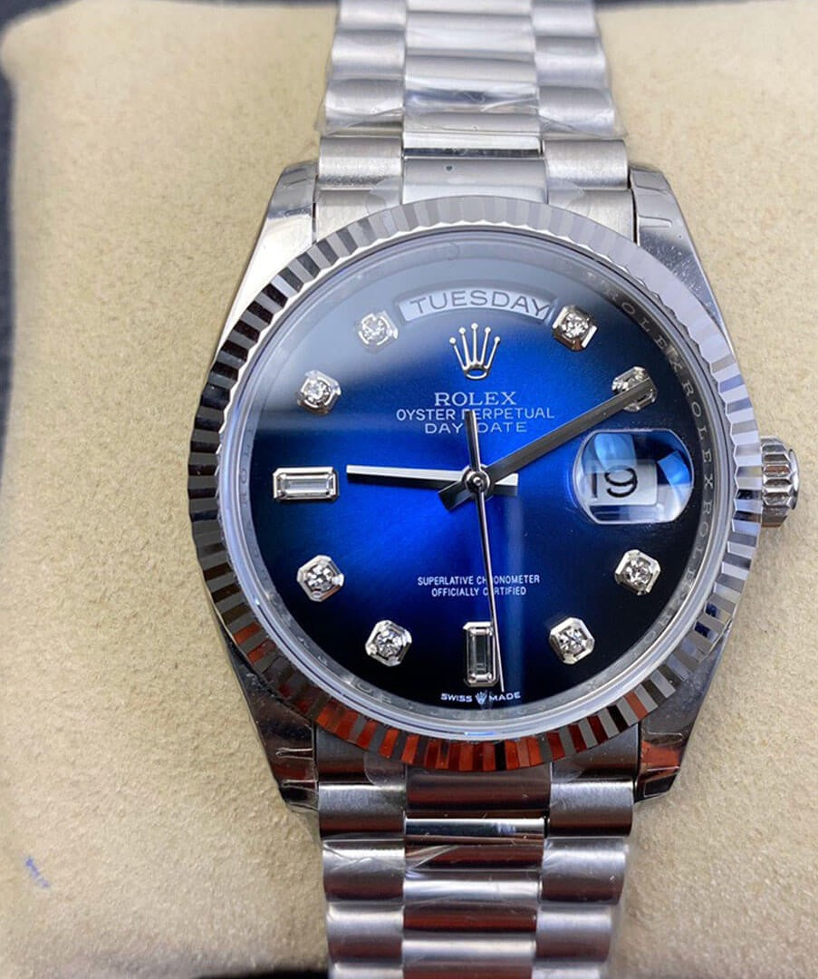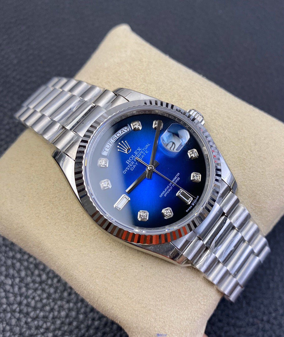 Rolex Day-Date 36 President White Gold Blue Baguette Dial