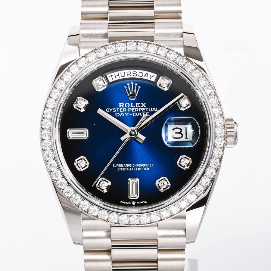 Rolex Day-Date 36 President White Gold Blue Baguette Dial Diamond Bezel