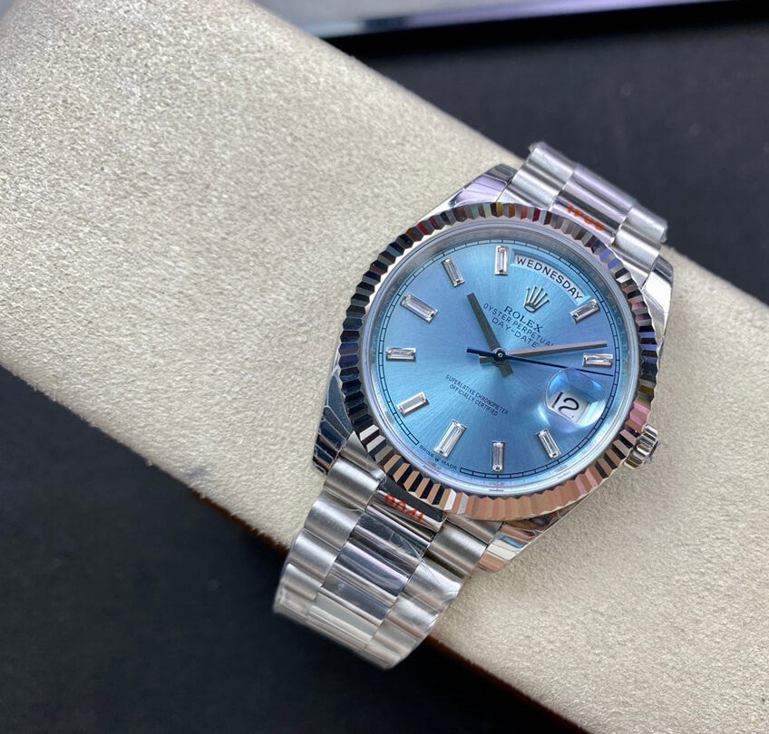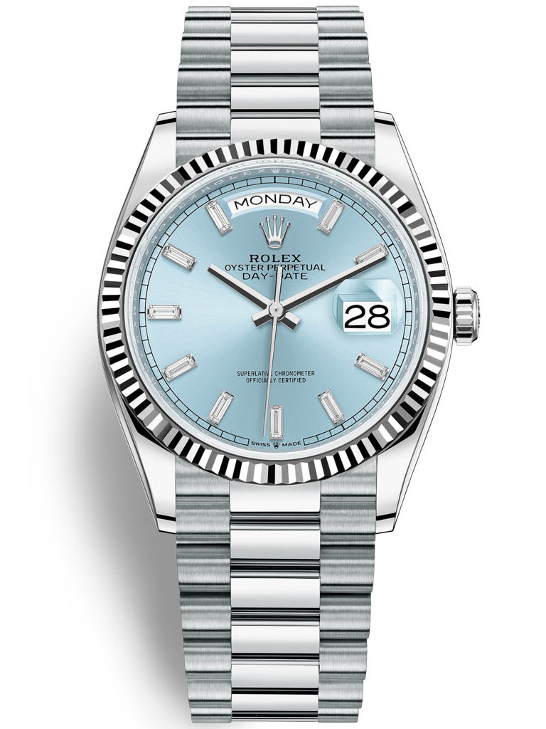 Rolex Day-Date 36mm President Platinum Watch Ice Blue Roman Dial With Diamonds Baguette