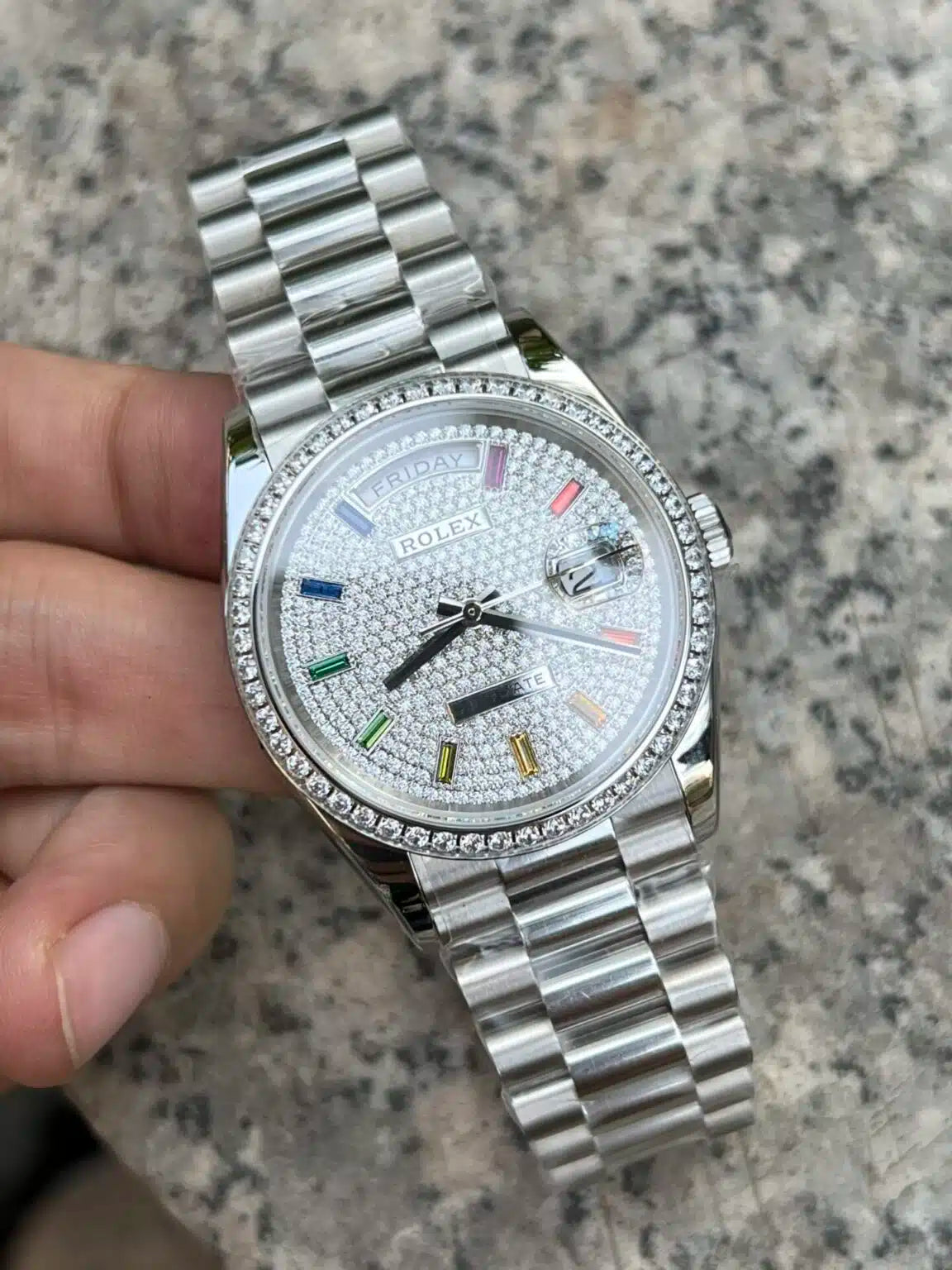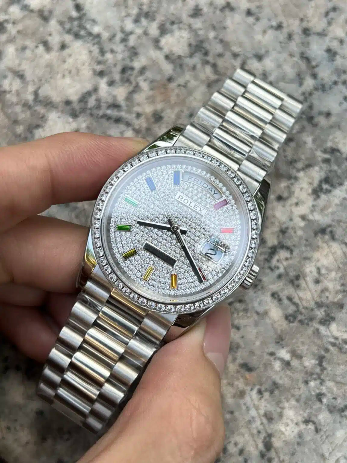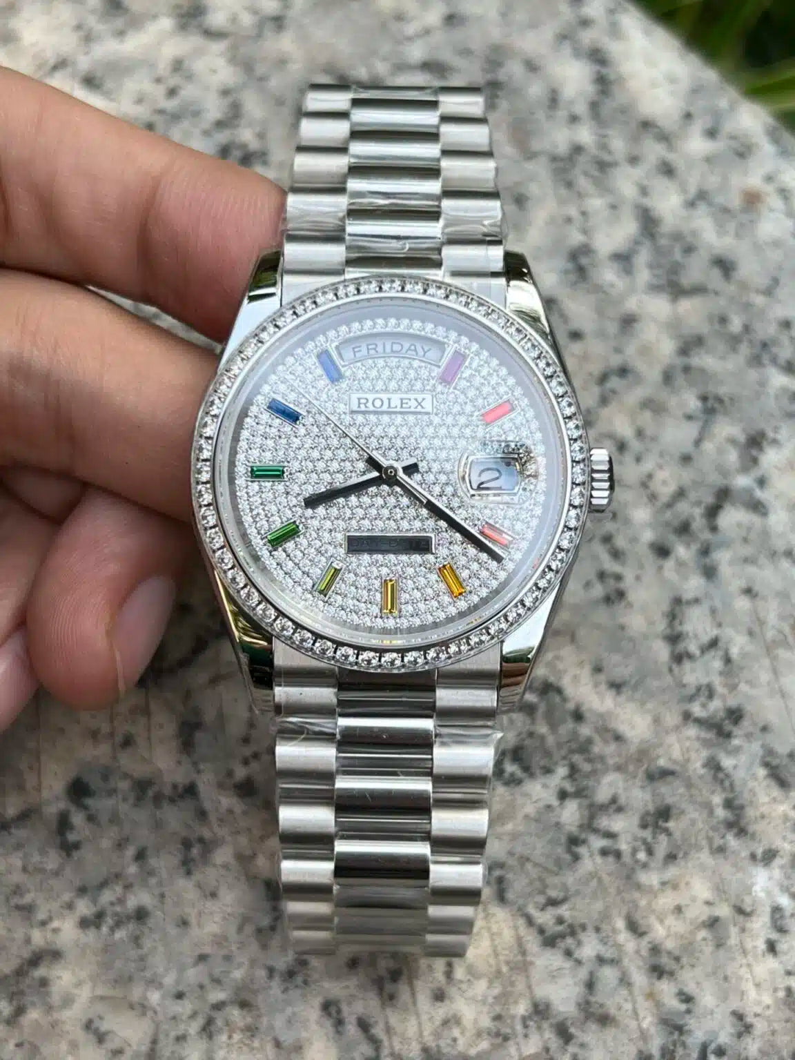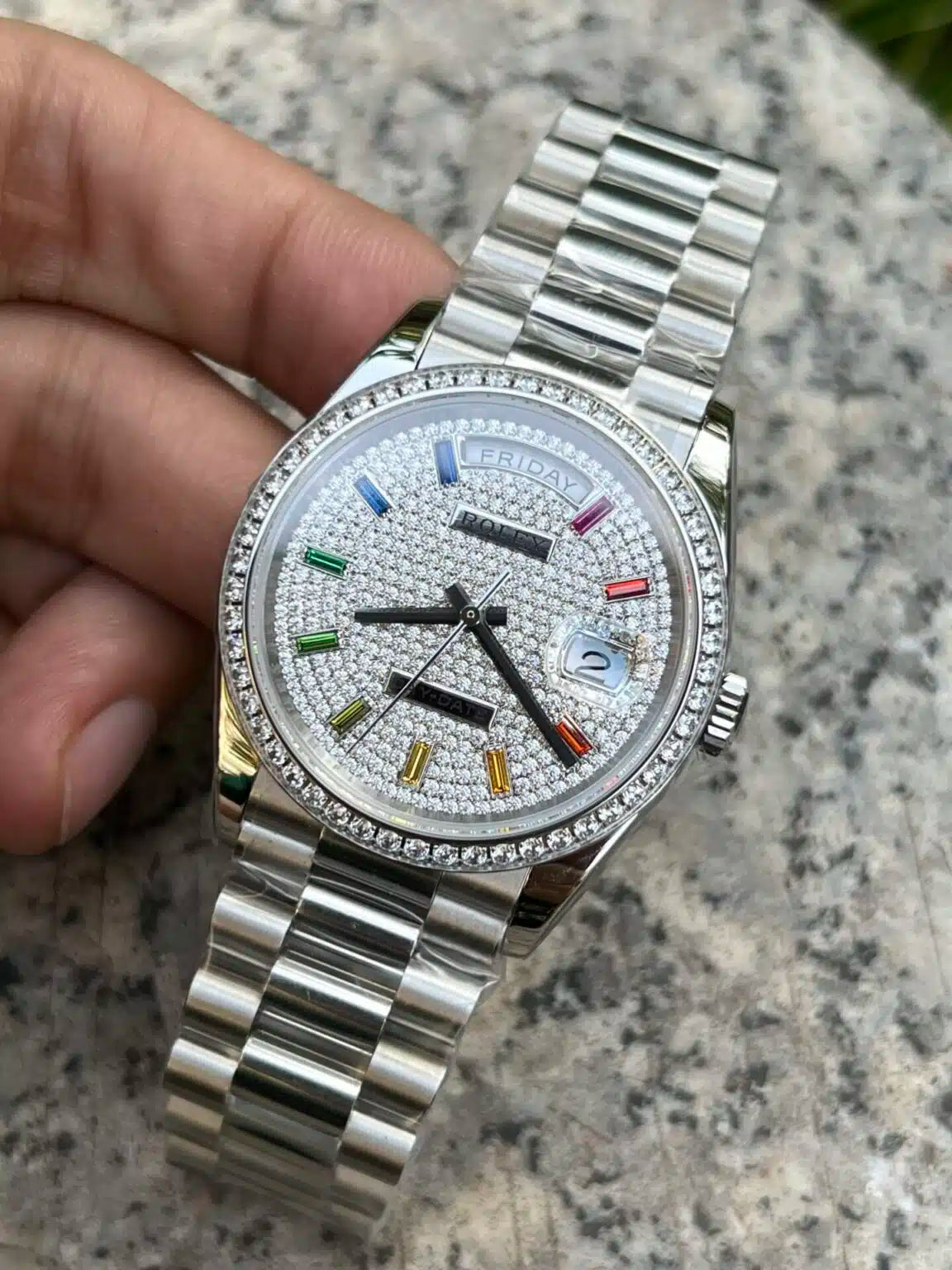Rolex Day-Date 36mm White Gold Paved Rainbow